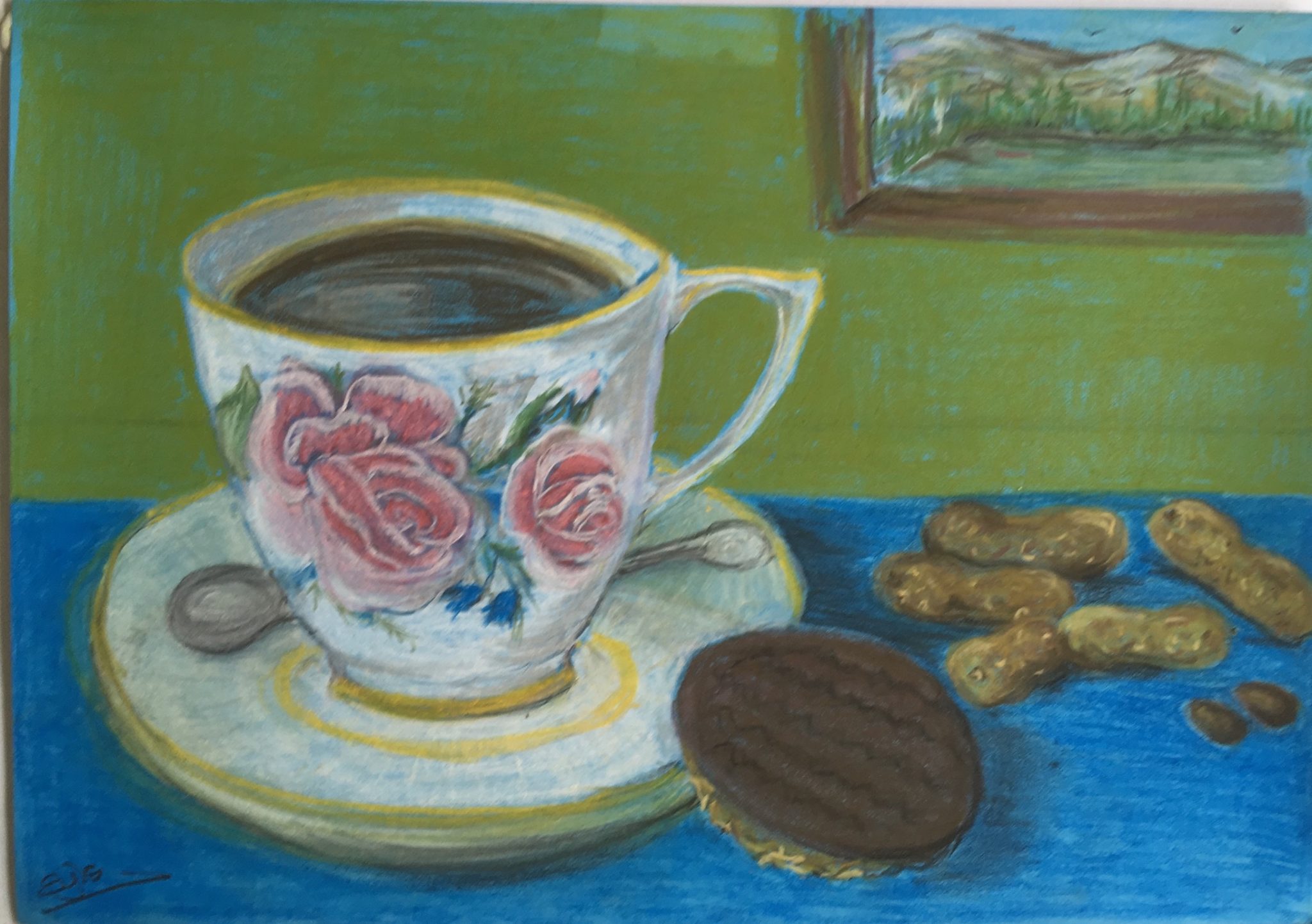 I like the overall composition of your pastel Sylvia.Good idea to add the saucer, spoon and that chocolate biscuit looks good enough to pick up and eat! I always admire people who can do pastel art work as I failed at that big time.